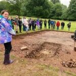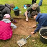 The MAYANS were given a tour of the site and then we split up into groups to do some digging. Two small groups set off to start digging test pits to investigate some of the anomalies picked up by geophysical surveying. The rest of the MAYANS were set to work in one of the main trenches, carefully excavating through a rubble layer which we suspected was on top of the remains of the foundations of the manor house. After lunch the groups rotated so everyone could experience the different trenches. Several metal detectorists were also helping out with the excavation and there was always great excitement when they found something in the spoil heaps or in the soil around the trenches.